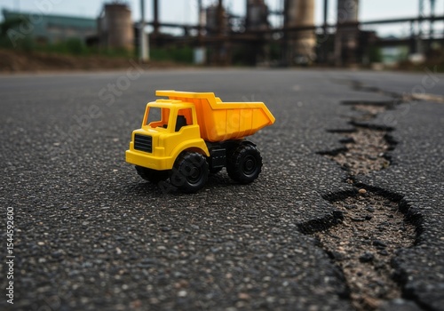 Small yellow toy dump truck on cracked asphalt with industrial background in soft focus outdoors