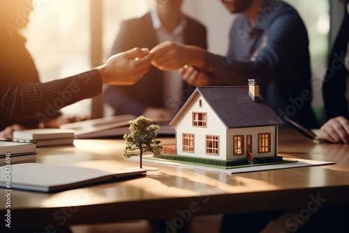 Smaller Residence Stands On Table Within Real Estate Agency, While Estate Agent And Clients Sign Rortgage Contract And Shake Hands In The Slightly Blurred