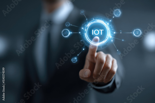 Smart business IOT, internet of things concept. Businessman touching IOT icon on virtual screen, connected internet network to access AI intelligence, business analytics, internet investing