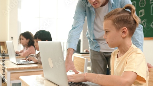 Smart caucasian boy using laptop to generated AI by coding engineering prompt. Diverse student learning or studying programing system while attending in STEM technology class. Technology. Pedagogy.