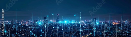 Smart city and communication network concept 5G IoT Internet of Things Telecommunication, dark blues lights