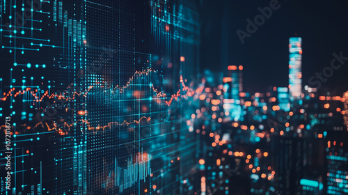Smart digital Innovation Business skyscrapers in the Financial District with connection network reciprocity over the cityscape. of future smart wireless digital city and social media networking