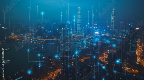 Smart digital Innovation city with connection network reciprocity over the cityscape. of future smart wireless digital city and social media networking systems that connects people with in city