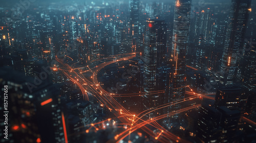 Smart digital Innovation city with connection network reciprocity over the cityscape. of future smart wireless digital city and social media networking systems that connects people with in city