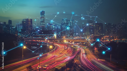 Smart digital Innovation city with connection network reciprocity over the cityscape. of future smart wireless digital city and social media networking systems that connects people with in city
