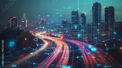 Smart digital Innovation city with connection network reciprocity over the cityscape. of future smart wireless digital city and social media networking systems that connects people with in city