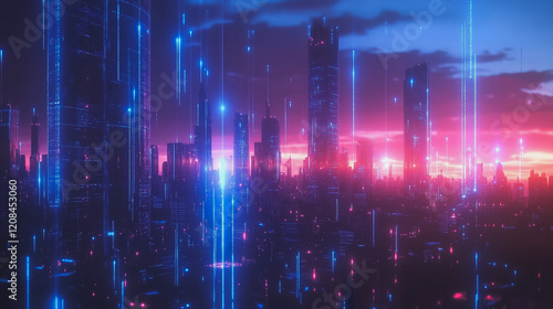 Smart digital Innovation city with connection network reciprocity over the cityscape. of future smart wireless digital city and social media networking systems that connects people with in city
