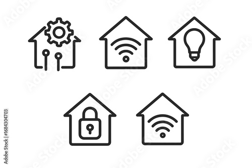 Smart home icon set for home automation system. Vector line icons for app interface. Includes concepts of security, lighting, connectivity, wifi, and internet of things.