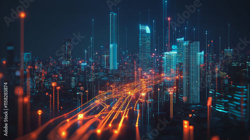 Smart Innovation city with connection cyber security network reciprocity over the night cityscape future wireless digital city and social media networking systems that connects people in the city