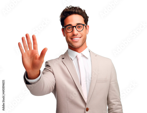 Smart young man dressed with elegant suit and making stop sign with hands. Isolated transparent background