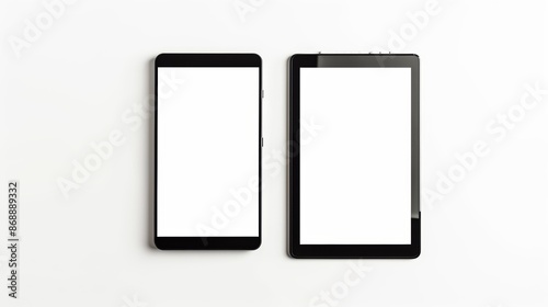 Smartphone and a digital tablet are lying on a white surface, showing a blank screen