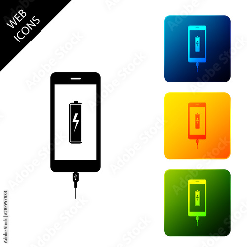 Smartphone battery charge icon isolated on white background. Phone with a low battery charge and with USB connection. Set icons colorful square buttons. Vector Illustration