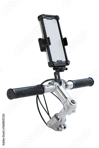 Smartphone mount for bicycle handlebars. A black, protective case encloses a smartphone, secured to a mount that attaches to bicycle handlebars. The mount is metal and black plastic