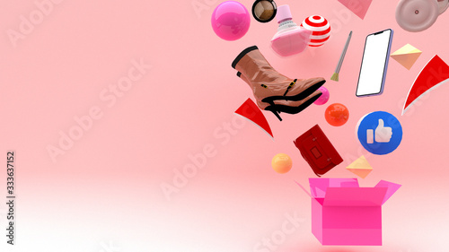 Smartphone surrounded by Shopping cart, shopping basket, shopping bag, clothes,shoes,cosmetic,cart ,store, and wallet on colour background. colorful balls on a pink background.-3d rendering.