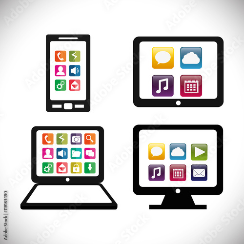 smartphone tablet laptop computer mobile apps application online icon set. Colorful and flat design. Vector illustration