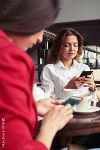 Smiling and serious gorgeous women surfing on Internet in smartphones during lunch with cup of coffee