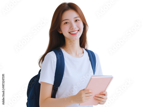 Smiling Asian Student Girl with Backpack and Notebook