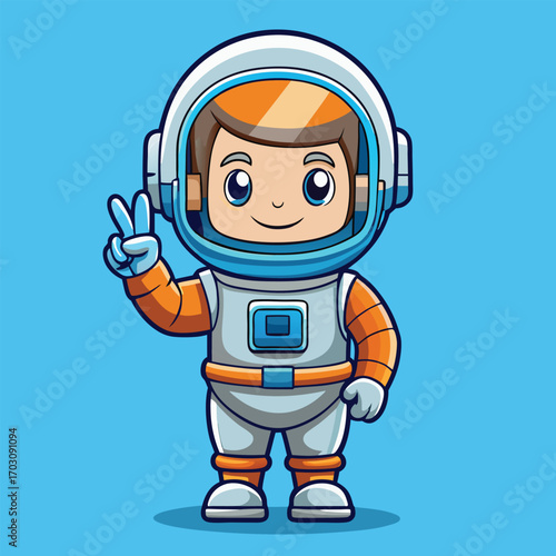 Smiling Astronaut Cartoon Character Making Peace Gesture in Bright Flat Illustration