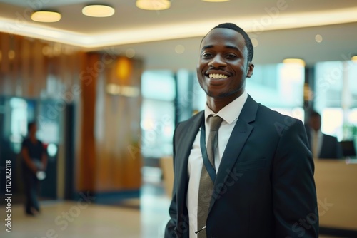 Smiling bank manager welcoming warm personality bright big smile in large building