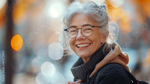 Smiling beautiful stylish cheerful sincere carefree happy gray-haired senior woman in glasses and sportswear rests hand on friend and laughs while talking outdoors.Morning run