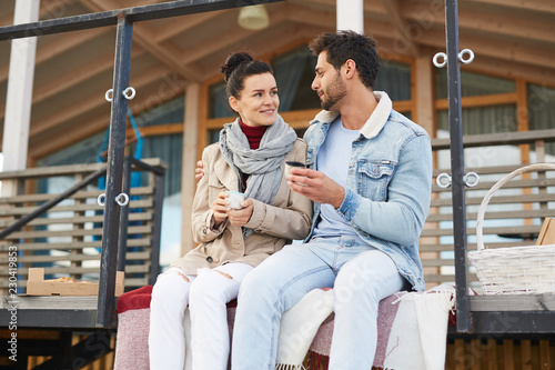Smiling beautiful young couple in love sitting on porch of modern house and looking at each other while drinking hot tea together and enjoying picnic outdoors