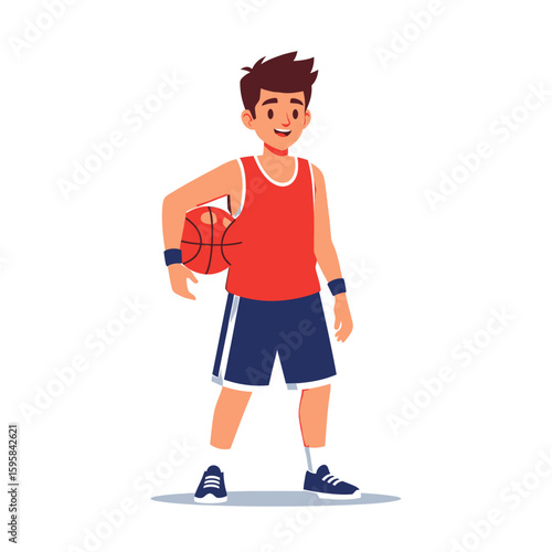 Smiling boy in basketball uniform holding a ball, ready to play.