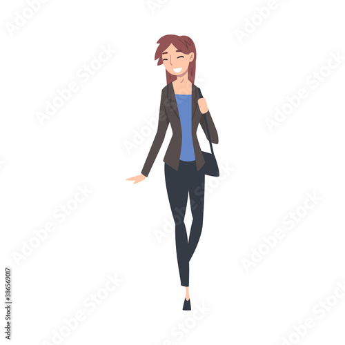Smiling Business Woman in Suit Walking with Bag Cartoon Style Vector Illustration
