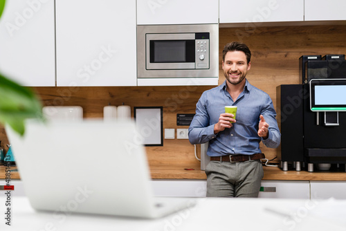 Smiling businessman on video call through laptop in kitchen