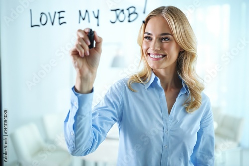 Smiling businesswoman enthusiastically marks her positive sentiment on a transparent screen in a bright office, showcasing engagement and a love for her professional environment.