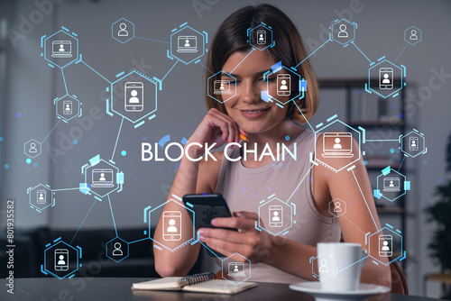 Smiling businesswoman in casual wear holding using smartphone typing at office workplace with notebook. Concept of distant work, business education. Blockchain crypto hologram