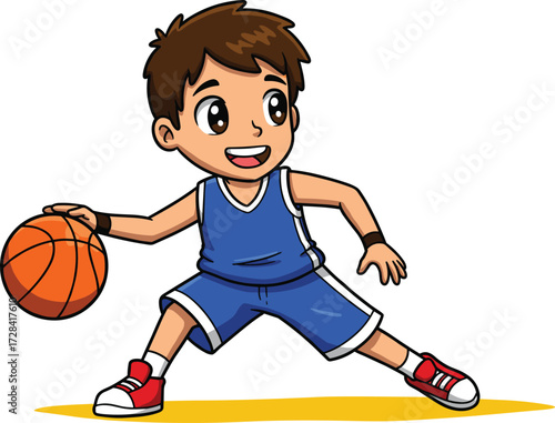 Smiling cartoon boy in blue basketball outfit, holding orange ball, sporty child character with red sneakers playing game on court illustration