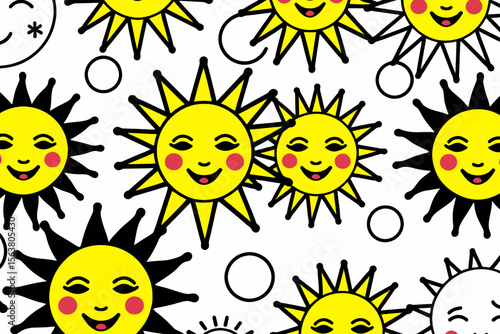 Smiling Cartoon Suns on White Background - Cheerful Yellow Sun Illustrations - Happy Sun Faces with Rosy Cheeks - Kids Room Art Print - Sunshine Pattern Design