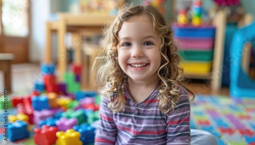 Smiling Child Playing with Colorful Building Blocks in a Playroom Setting