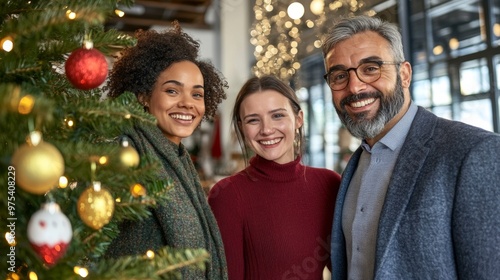 Smiling colleagues posing by a beautifully decorated Christmas tree, enjoying the festive atmosphere in a modern office setting.