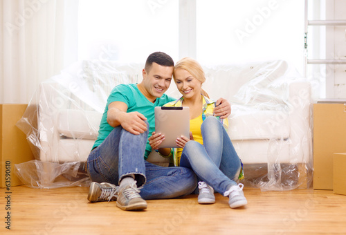 smiling couple with tablet pc in new home