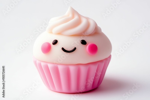 Smiling cupcake; pink, white frosting, happy face.