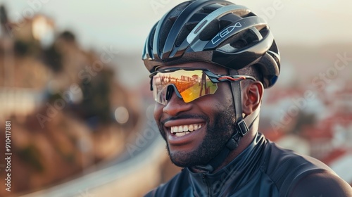 Smiling cyclist against a bustling city backdrop