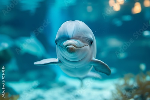 smiling dolphin in blue water, dolphin and human