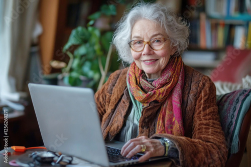 Smiling elderly woman with glasses participates in an online language class while using her laptop in a cozy indoor setting