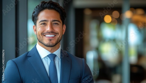 Smiling elegant confident young professional Latino hispanic business man , male proud leader, smart Latin businessman lawyer or company manager executive looking at camera standing in office