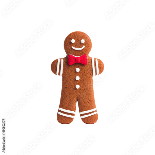 Smiling gingerbread man with red bow tie and white icing details stands against plain background, evoking festive and cheerful holiday spirit