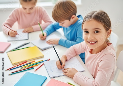 Smiling Girl Drawing with Pencils in Bright Classroom with Classmates