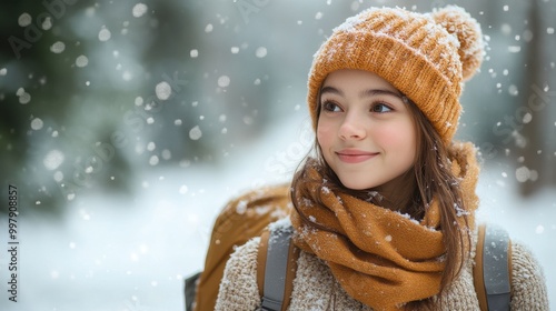 Smiling Girl in Winter Attire Enjoying Snowfall