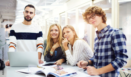 Smiling handsome young international students resting after lesson