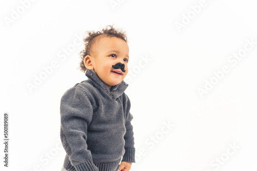 smiling little schild with fake mustache is rejoicing, medium shot on the white background. High quality photo
