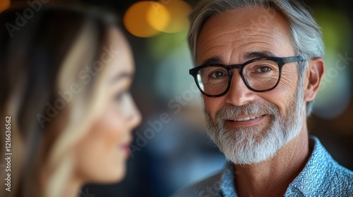 Smiling man engages in conversation with a young woman in a cozy cafe during golden hour with warm lighting creating a relaxed atmosphere
