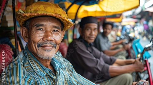 Smiling Man in a Yellow Hat, Riding a Cycle Rickshaw
