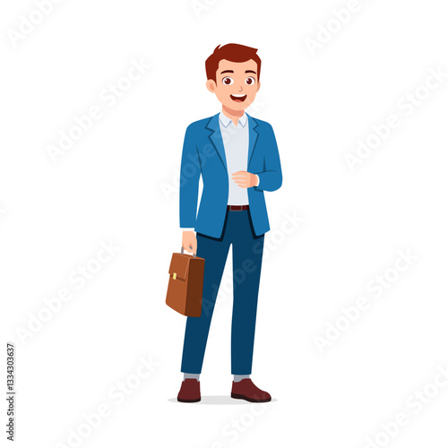 Smiling man in suit holding a briefcase standing with professional look in white background