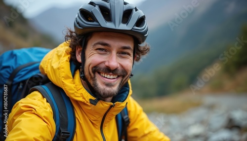Smiling man with backpack wears helmet, yellow jacket outdoors. Happy cyclist enjoys sport on mountains. Tourist explores nature landscape. Travel blogger shoots content. Hiker smiles during active