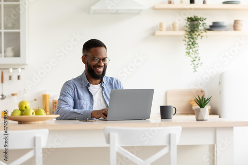 Smiling millennial african american bearded guy in glasses working on laptop in minimalist kitchen interior